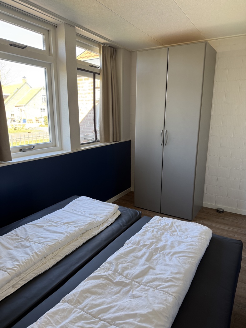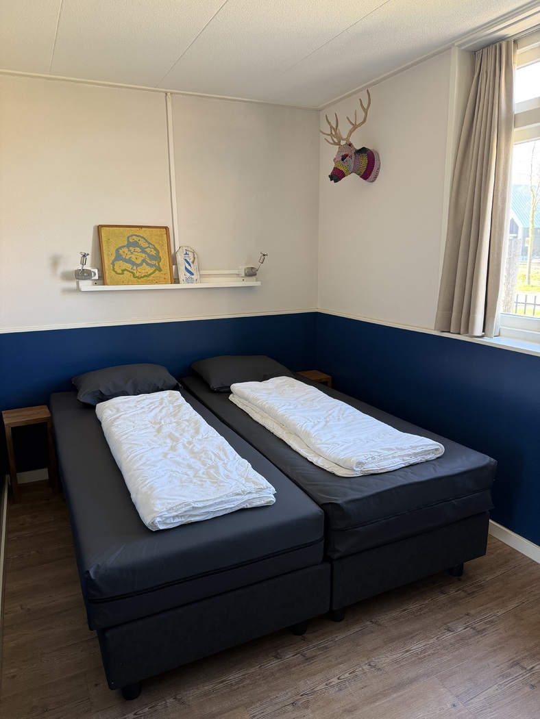Ferienbungalow 'Stern' für 4 Personen im Park Stee aan Zee. Das Wohnzimmer verfügt über eine Sitzecke, einen Esstisch und einen Fernseher. Die Küche ist mit einem Vier-Flammen-Herd, einer Kaffeemaschine, einer Mikrowelle, einem Kühl-/Gefrierschrank, einem Geschirrspüler und einem Wasserkocher ausgestattet. Beide Schlafzimmer haben zwei Einzelbetten (80x200). Das Badezimmer hat eine Dusche, Waschbecken und Toilette. Es gibt auch eine Zentralheizung und kostenloses WLAN. Draußen haben Sie einen Garten mit möblierter Terrasse.